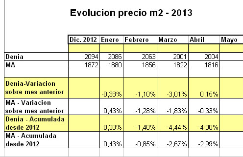 De nuevo mayo ha venido marcado por pérdidas en el precio del metro cuadrado en Dénia y en toda la Comarca de la Marina Alta. Los vendedores, sobre todo los bancos, han continuado bajando sus precios de forma paulatina aunque no alarmante.